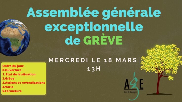 L’assemblée exceptionnelle de grève de l’AGEBdeB se passe le 18 mars à 13h au gym du centre sportif.